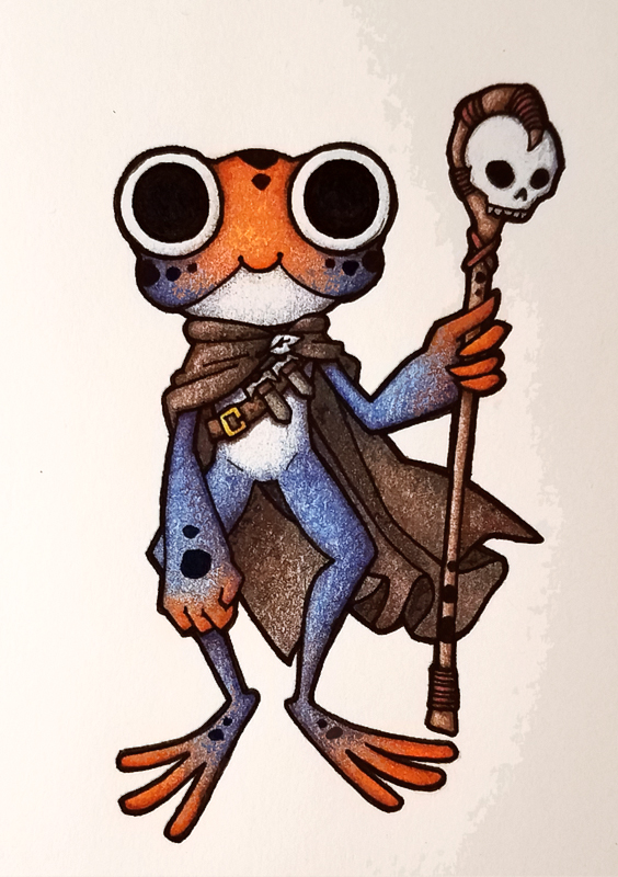 Bop was a cute little froggie with a horrid past. He lived in a small Grung village where everyone had their role - he was a scribe. Most of his work consisted of translating other text into Grung so other could more easily understand it.* After some time translating froggie bedtime stories, Bop decided he was meant for more and went out to explore something exciting! Giants! It was very scary, but he gathered lots of important information and returned back to the tribe overladen with sheets of paper. Unfortunately, Bop had neglected to notice the giant stealthily following him and when he went inside his wee froggie house to catalogue his notes, he started hear crunching outside. The villagers were being squashed! After a pitiful fight back, Bop was almost alone in survival. This was no home for them anymore. They grabbed a few of their friends’ skulls and tied them to their staff, a reminder of their past, before leaving the village, ready to seek knowledge on how to bring them all back.